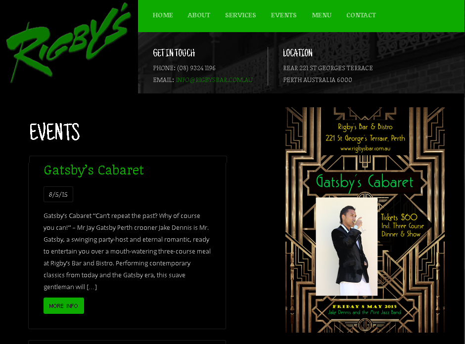 P.S. Tickets to “Gatsby’s Cabaret,” a live cabaret show and three course dinner at Rigby’s Bar and Bistro, are selling fast. Book your tickets today! Jake Dennis and the Mint Jazz Band’s previous cabaret shows (Come Fly With Me and Like Blown Smoke) both sold out in advance of their opening nights! 😉